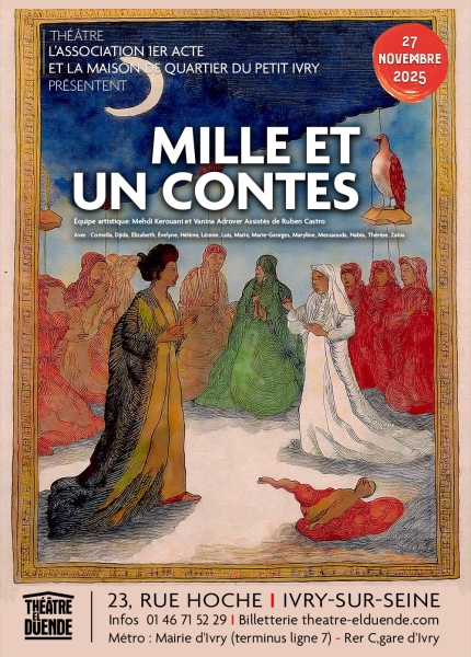 Mesdames et messieurs, soyez bien attentifs, ce soir nous vous racontons l’histoire bien connue et fantastique des 1001 nuits, avec 1001 contes, modernes et magiques. Au cœur de l’orient, contrée des étoiles et de l’imaginaire, nous allons plonger dans l’histoire de femmes qui se battent, qui luttent pour faire valoir leurs droits, pour leur indépendance et leur liberté. C’est parti pour 1001 contes 2.0 #petitivry2025 !