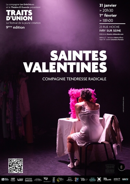Saintes Valentines est un mini-cabaret burlesque en piano-voix porté par Anaïs Gallard, comédienne, danseuse et performeuse burlesque, et Clémentine Lamothe comédienne, chanteuse.  Sur scène, un piano, une table, une chaise, et une penderie qui déborde de costumes extravagants. Nous sommes dans l’intimité d’une chambre.  Nous assistons aux turpitudes et aux aveux sans masques d’une jeune femme, qui se prend sans cesse les pieds dans les tapis de l’Amour. Avec humour, recul et un peu de cynisme, en format stand-up, elle nous livre son journal intime et nous raconte ses réflexions, ses anecdotes, sans amoindrir ses folies. Elle dépeint le tourbillon du besoin d’amour, et de l’échec permanent. Son Alter-égo, effeuilleuse burlesque, vient la sortir de sa solitude, et vie pour elle tout ses fantasmes: se transformant au gré des chansons, en femme fatale, mariée éplorée ou Dom Juan. A grand coup de chansons d'amour, de numéros de cabaret et de confessions sans retenues, on plonge tout entier dans l'universel d'un journal intime.